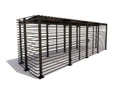 Контейнерные площадки изготовлены из профильного материала, не имеют сплошных стенок и оснащены калиткой с замком. Крыша выполнена из профильного листа, установлена под небольшим наклоном. Объект рассчитан на два стандартных мусорных бака.